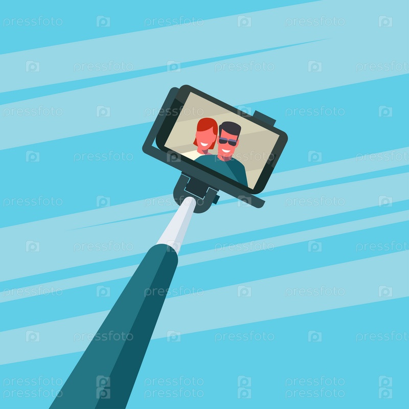 Портрет улыбаясь молодая пара на смартфоне. Селф палку монопод. Фон абстрактный неба