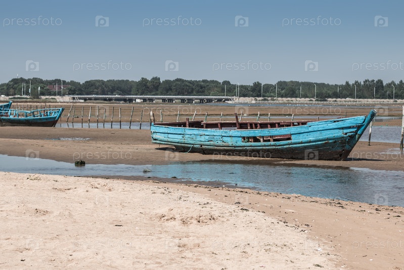 Заброшенные рыбацкие лодки после отлива на Желтом море