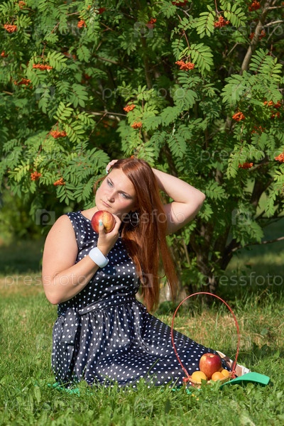 Девочка держит яблоко в руке на пикнике