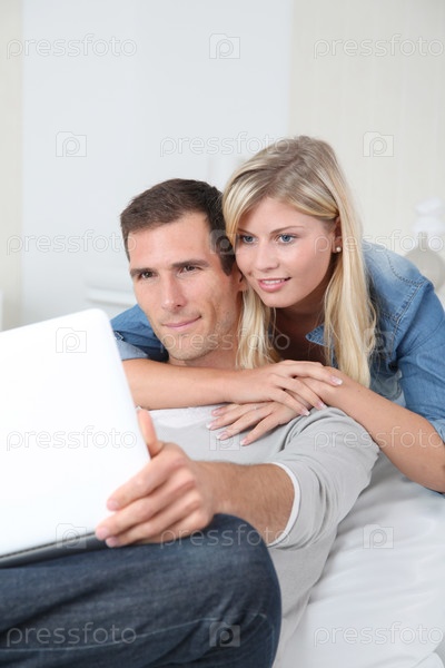 Крупным планом пара, сидя в диване с ноутбуком