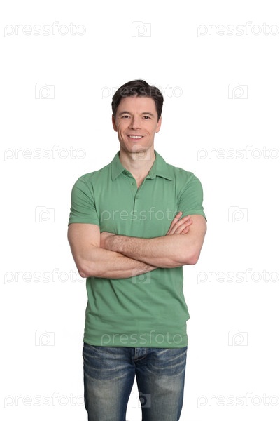 Взрослый человек с зеленой рубашке стоя на белом фоне