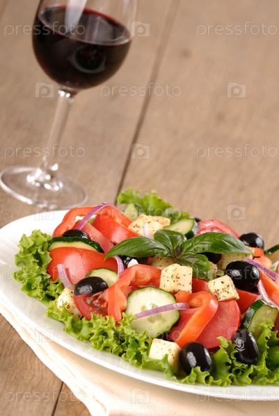 Греческий салат и бокал красного вина на дубовый стол