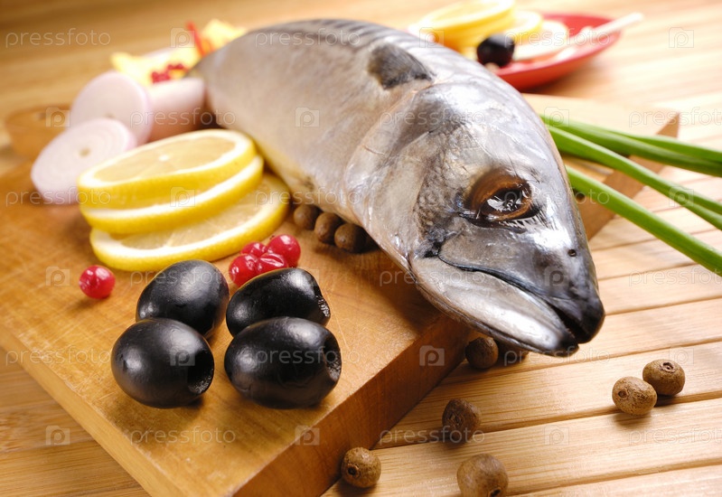 Свежей скумбрии с оливками, лимоны и лук через деревянные разделочные доски