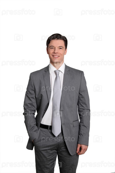 Бизнесмен, стоя на белом фоне