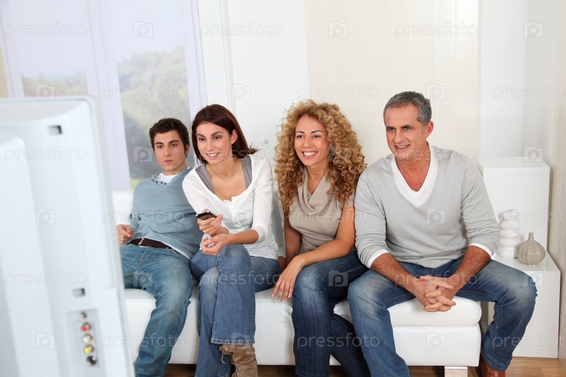 Группы друзей, сидя в диван смотреть телевизор