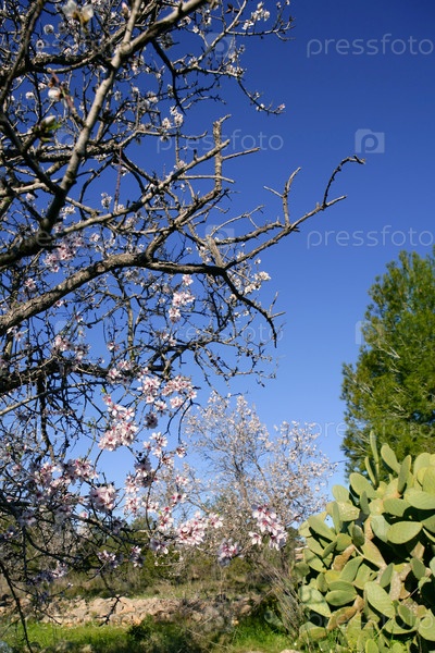 Миндальное дерево и Нопал Кактус цветок в средиземноморской