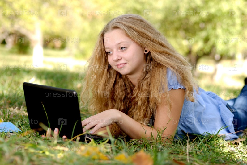 Привлекательные подросток девушка весело с ноутбука на открытом воздухе