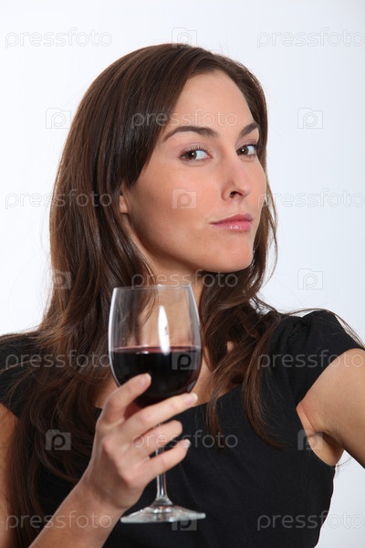 Красивая женщина в черном платье, дегустация красное вино