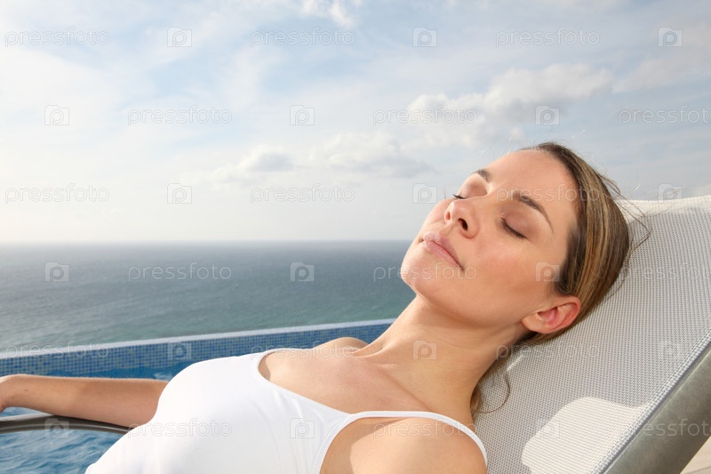 Женщина, расслабляясь в шезлонге у бассейна