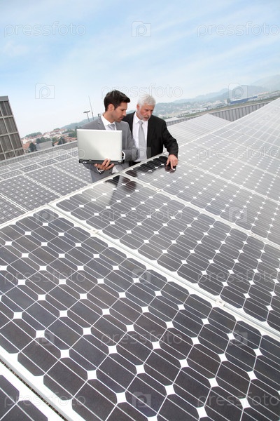 Деловые люди, стоя у солнечных панелей