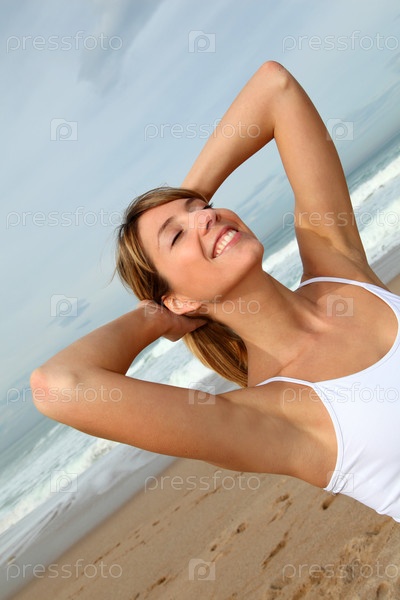 Красивая женщина, дыхание свежего воздуха на пляже