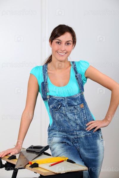 Молодая женщина, стоя на верстаке дома