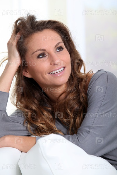 Портрет красивые улыбающиеся женщины, расслабляясь в диван