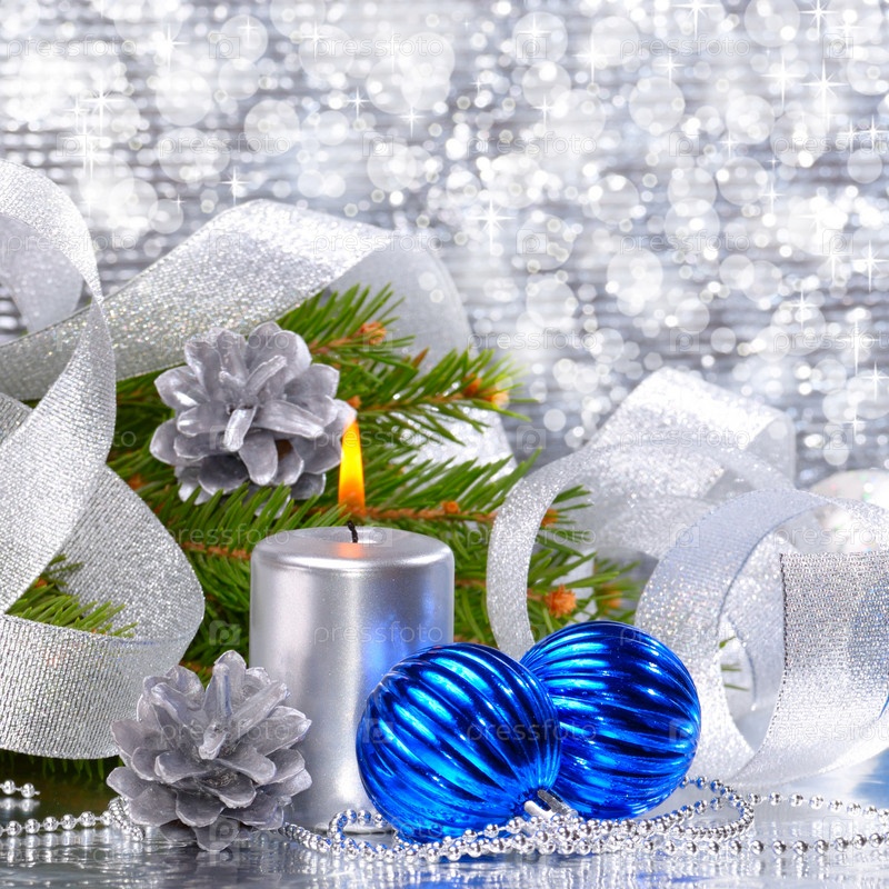 Голубые елочные шары с серебряные свечи на ярком фоне