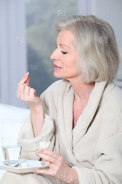 Старшие женщины в халате принимая таблетки