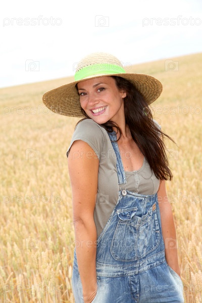 Красивая женщина с соломенной шляпе стоит в поле пшеницы