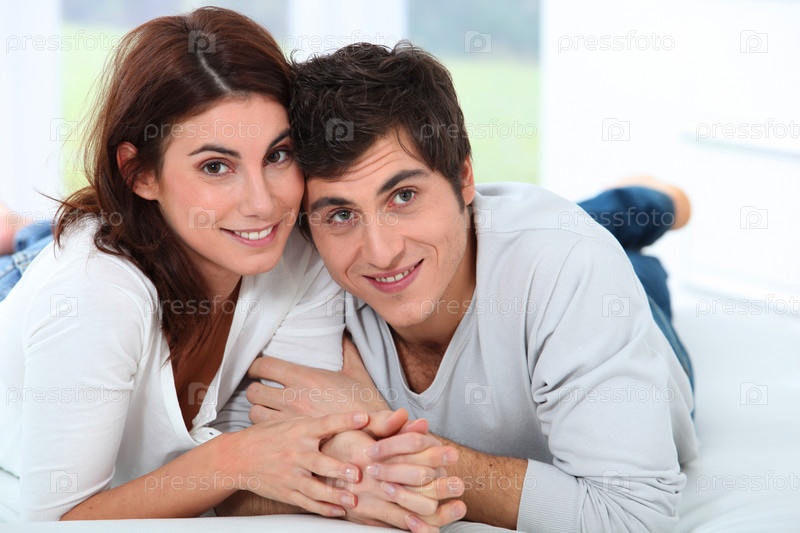 Молодая пара, лежа на диване