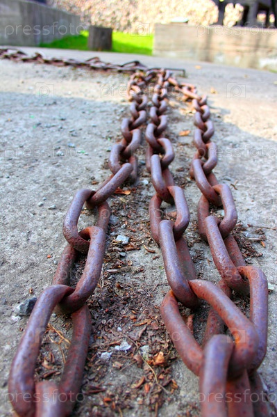 Металлическая ржавая цепь на асфальте в ближайшем плане