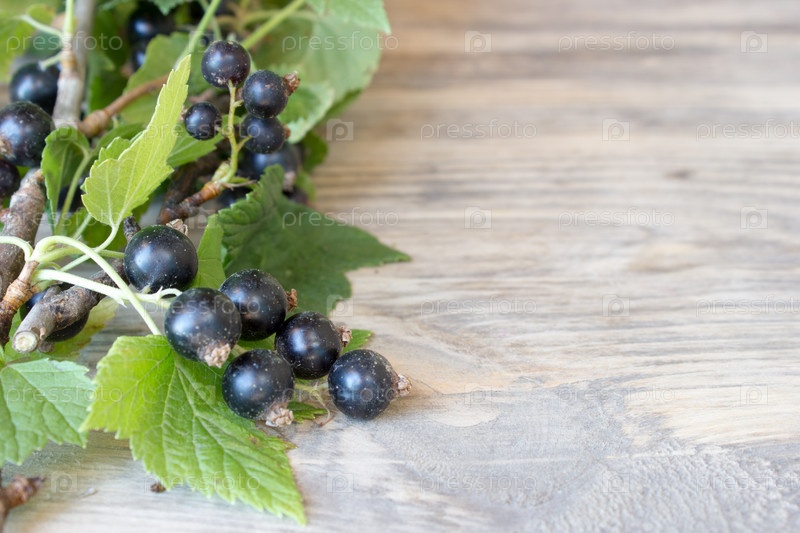 Черной смородины и зеленые листья на деревянный стол