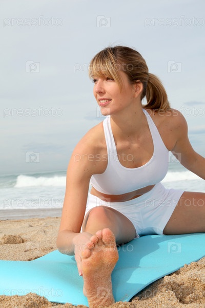 Красивая женщина, растяжения на песчаном пляже