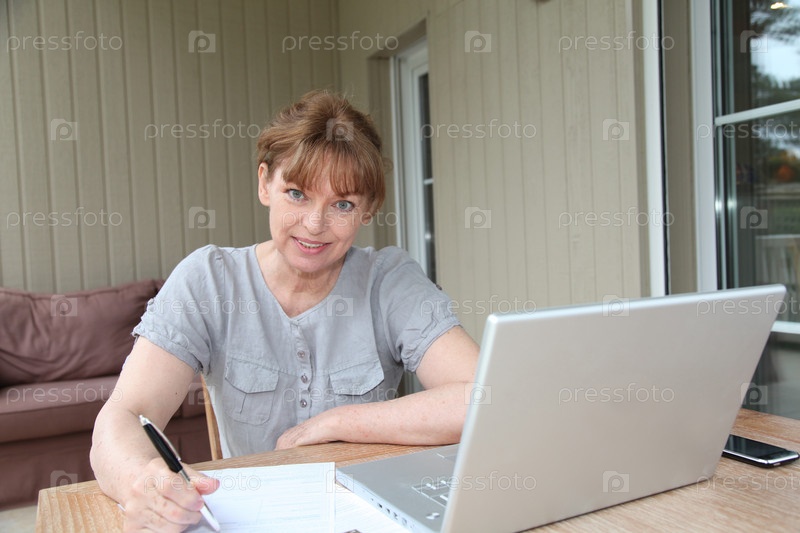Старшие женщины, заполнив форму с помощью Интернета