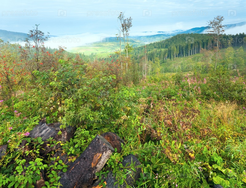 Карпатские холмистые горы в сентябре облачным утром