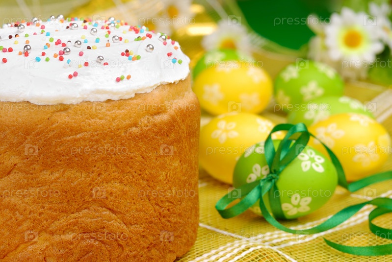 Пасхальные яйца и торт на ярком фоне