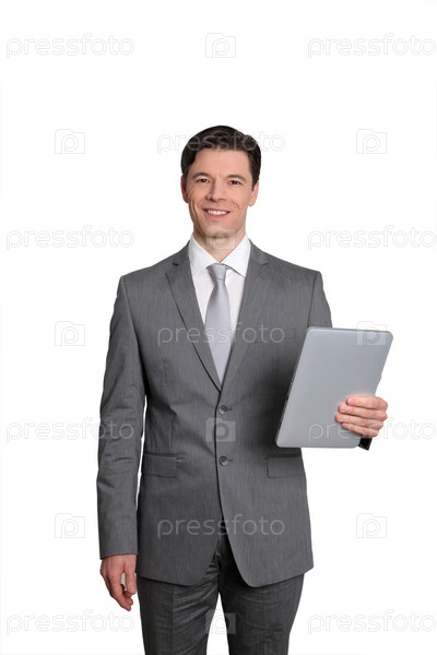 Бизнесмен, стоя на белом фоне с сенсорной панелью