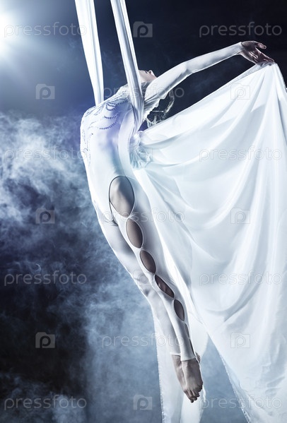 Молодая женщина гимнастка. На черном фоне с дымом