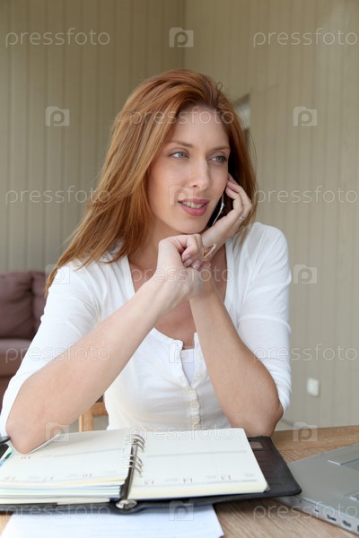 На дому самостоятельно занятая женщина разговаривает по телефону