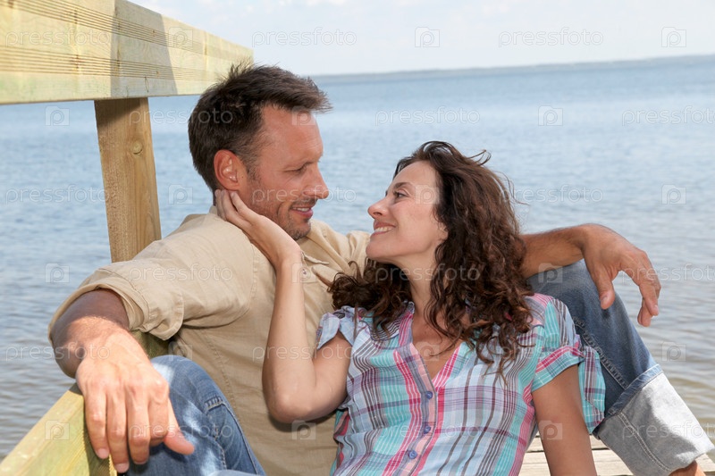 Крупным планом влюбленная пара, сидя на понтон на берегу озера
