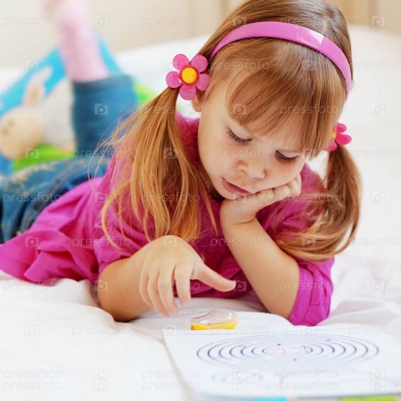 Маленькая девочка рисует. В домашних условиях, на кровате