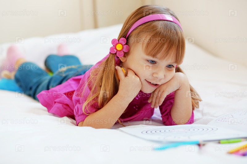 Маленькая девочка рисует. В домашних условиях, на кровате