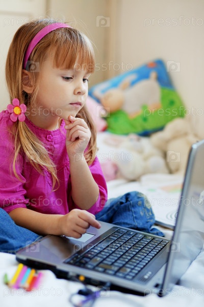 Маленькая милая девочка играет с ноутбуком у себя дома