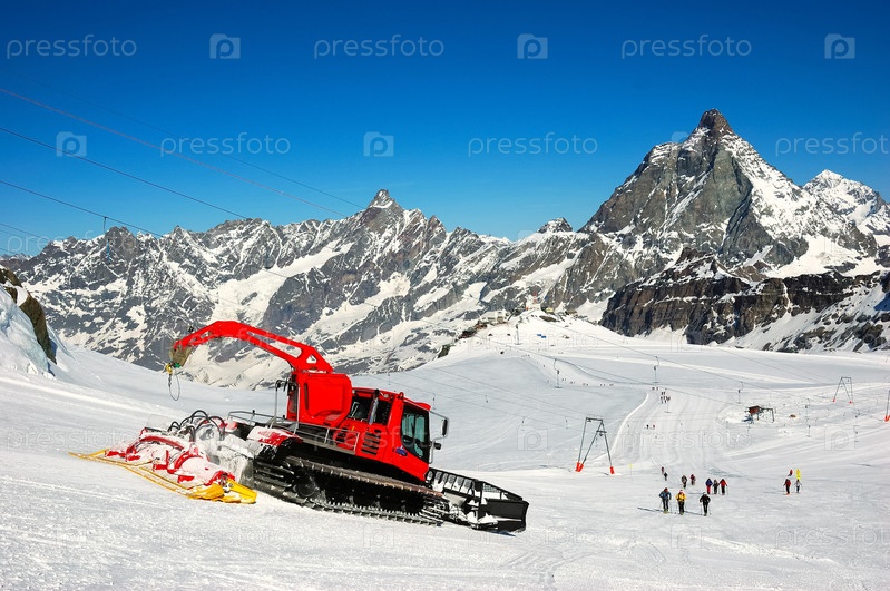 Снегоочиститель работает на лыжном склоне. Зимний горнолыжный курорт, Церматт, Швейцарский