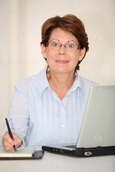 Крупным планом старший женщины, работающие в офисе с портативного компьютера