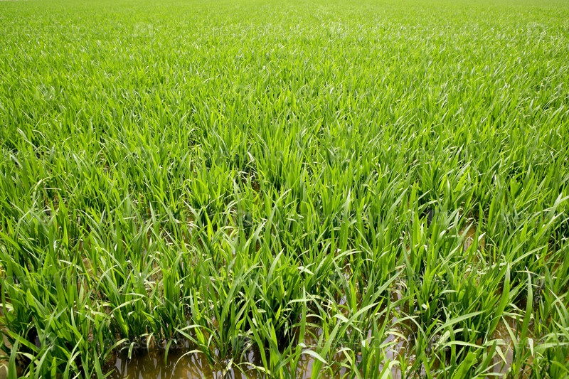 Зеленые рисовые растений весной поля орошения