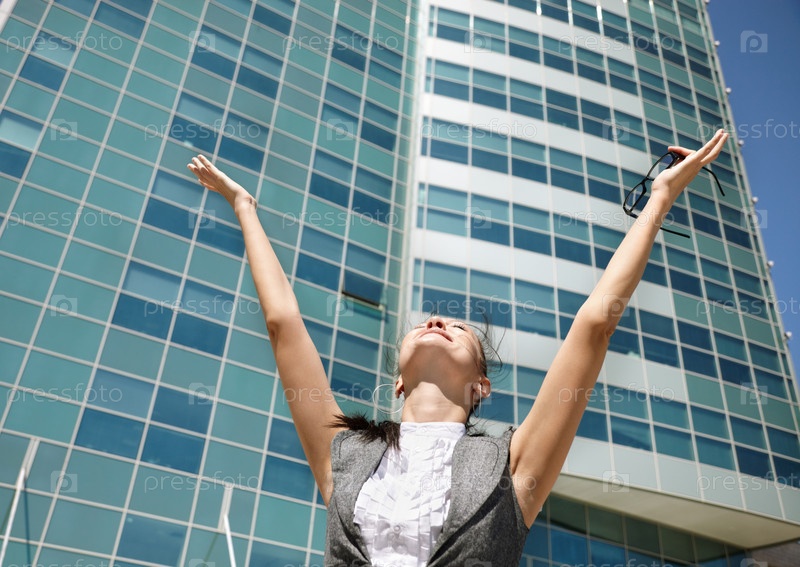 Счастливый предприниматель на фоне современный бизнес центр, выборочный фокус