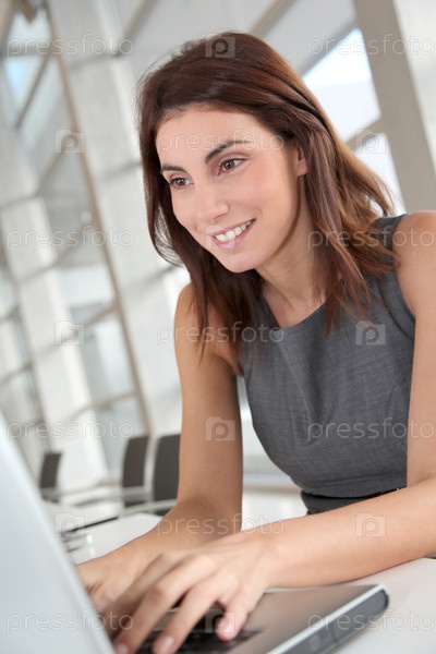 Исполнительный женщина, работающая на портативном компьютере