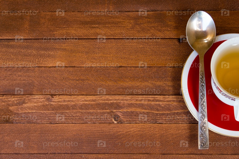 Время чая перерыв на представлении столешницы. Деревянные старинные стол с Кубка с копией пространства