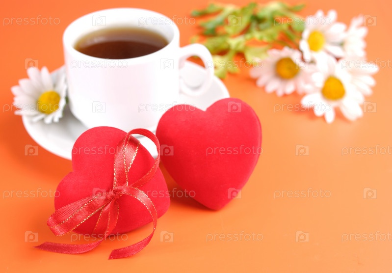 Красные сердца и Кубок на оранжевом фоне