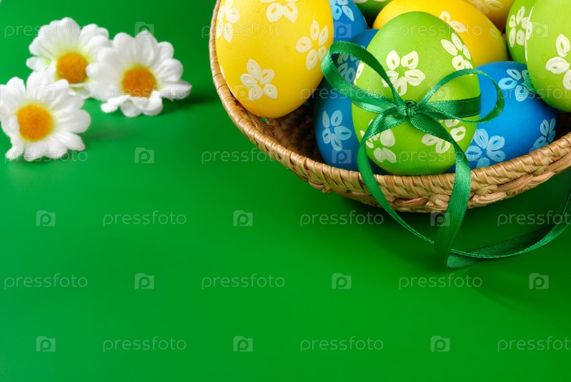 Пасхальные яйца в плетеной корзине на зеленом фоне