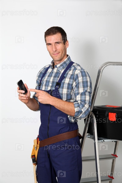 Сантехник, стоя на белом фоне