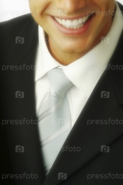 Человек улыбается и имеет совершенный зубы и умный костюме