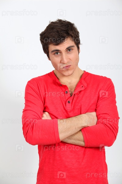 Человек в красной рубашке с руками, скрещенными на белом фоне