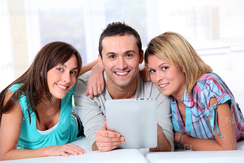 Группы друзей прокладки на диване у себя дома