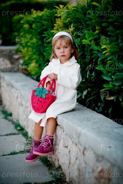 Маленькая девочка сидит на бордюре в парке