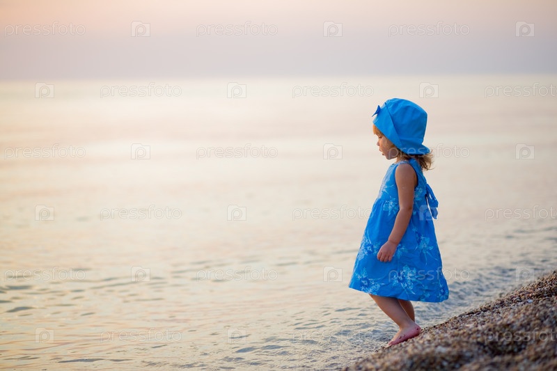 Маленькая девочка в голубом платье и шляпке на берегу моря