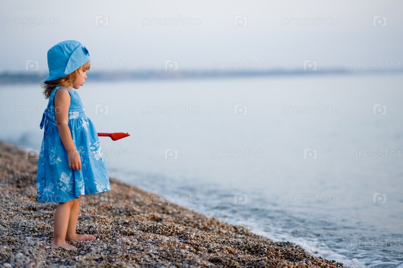 Маленькая девочка в голубом платье и шляпке на берегу моря