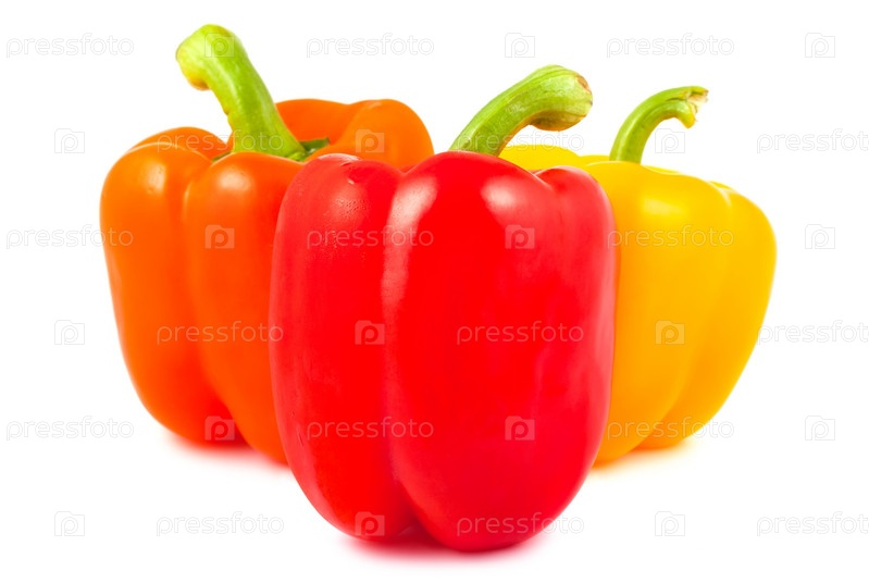 Оранжевый, красный и желтый болгарские перцы на белом фоне